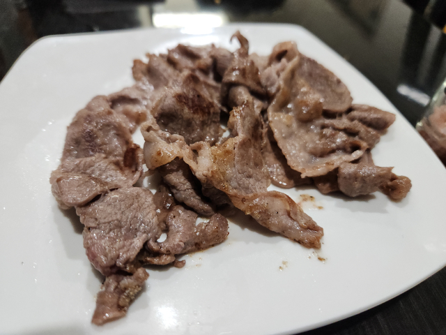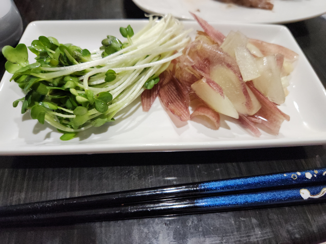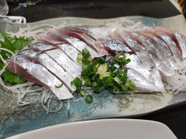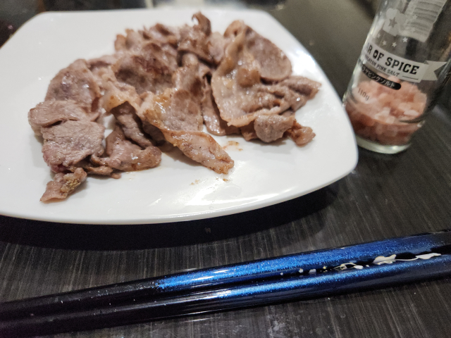 よくスーパー内で、ホットプレートで塩こしょうだけで肉やいてて、つまようじで、どうぞってやるやつ あれ、おいしい で、妻にアレ風にとオーダ 満足 あとは、アジの刺身と薬味で一杯 トーストと明太もはずせん
