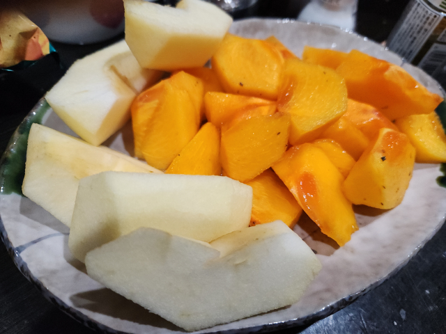 お昼の、きんのつるで満腹がおさまらず 柿、リンゴからの 肉まん、からあげ、ピザで一杯。。 久々に今日はよく働いた。