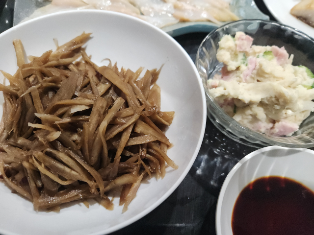 きんぴらゴボウ、ほっけ、ポテサラ、貝の刺身 今日はサスケの1stステージ外国人編から2stまで見たな