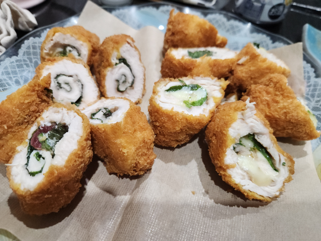 「不適切にもほどがある」復習中 スペシャル見るために。。。 昭和育ちの私には、ほんとおもしろい ・鶏ササミの梅シソ巻きフライとチーズ巻きフライ ・豚のバラ焼き ・ポテサラ ・貝のお刺身 ・大根葉のお漬物